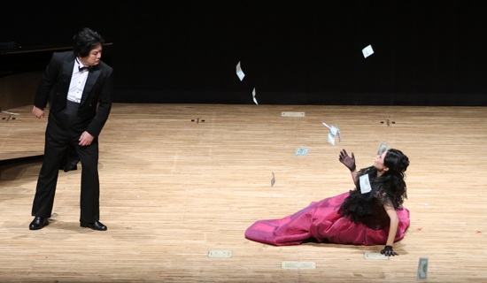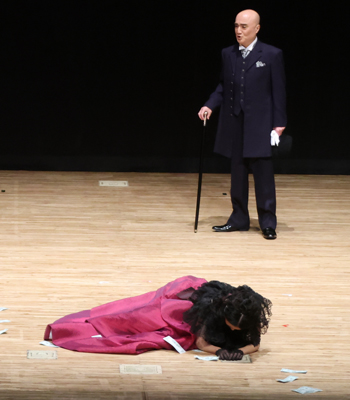 彼女を追ってきたアルフレードはヴィオレッタに迫るも、男爵を愛していると言うのを聞き逆上して、大勢の前で札束を投げつけ侮辱し、ヴィオレッタをひどく悲しませる。